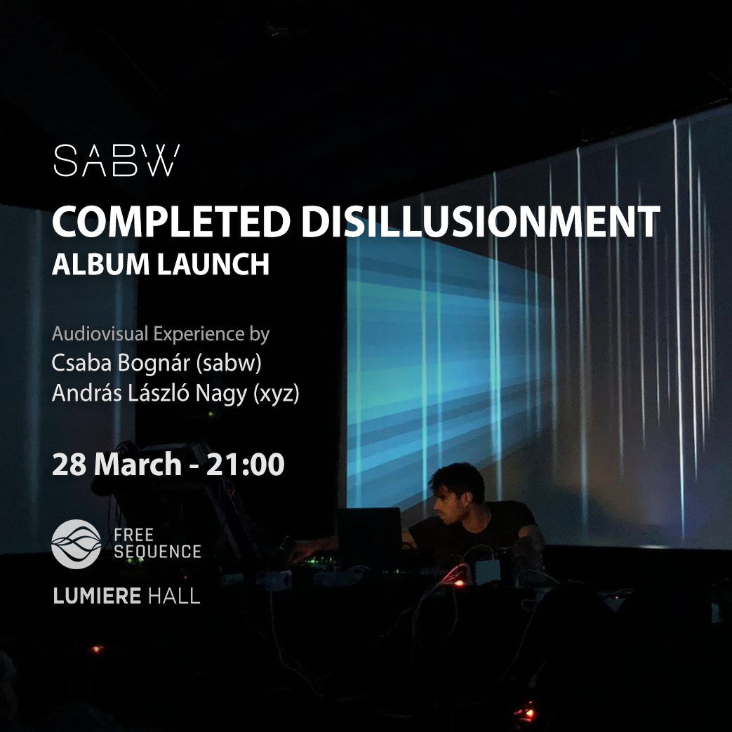 SABW's new album COMPLETED DISILLUSIONMENT will be released on March 28th on the FREE SEQUENCE label. It will be presented in a special projection room at Lumiere Hall in Budapest, accompanied with unique visuals by László András Nagy (XYZ).