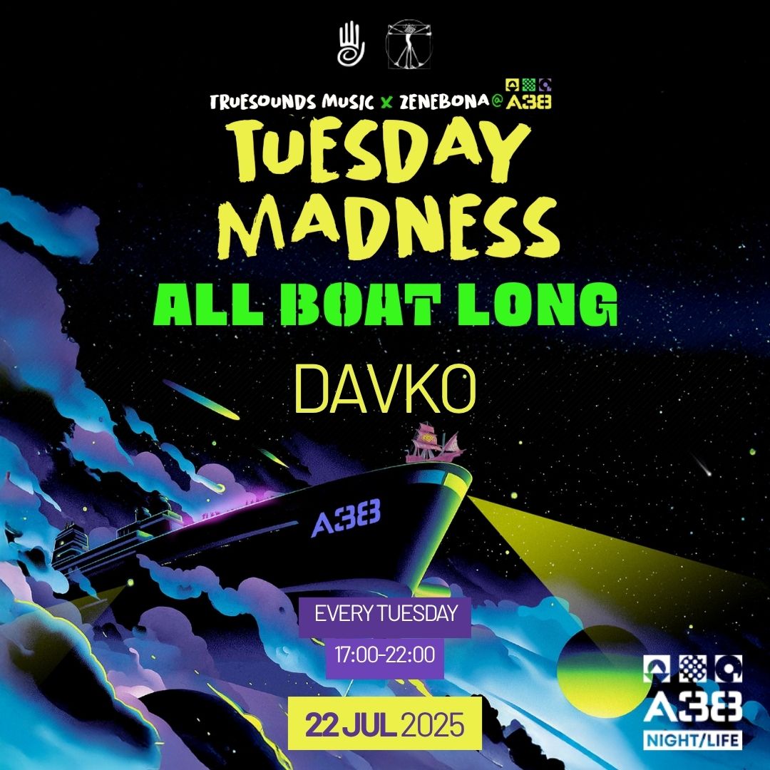 Get ready for the ultimate Tuesday Madness vibe at A38's cool terrace! We're bringing you a diverse mix of Deep House, Organic House, Melodic House, Progressive House, and Melodic Techno genres with Truesounds Music and Zenebona Records. Join us for a chill evening, great music, and of course a self-absorbed dance. See you there every Tuesday!