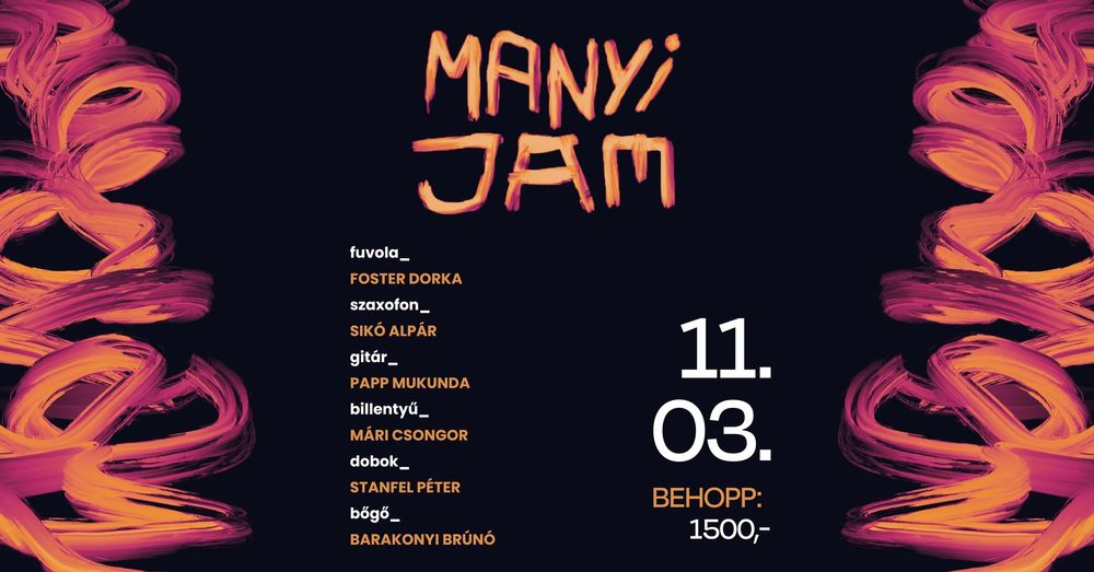 Manyi jam: Improvised concert every other Monday, with varying lineups, featuring selected performers from Budapest's music scene.