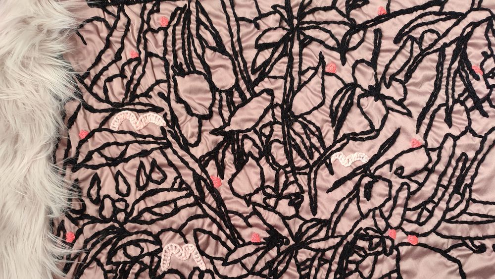 A gyökér tehát mint képi forma egyszerre utal a saját identitás mélyebb rétegeinek feltárására, valamint arra a körülölelő közegre, amelyben ez az átalakulás végbe tud menni. A művek így nem csupán az anyaság intim, belső munkáját jelenítik meg, hanem azt is, miként kapcsolódik mindez a természet lassú és kitartó működéséhez: a rejtett növekedéshez, a rezilienciához, alágy alkalmazkodáshoz. A textilművészet manuális, időigényes gesztusai tovább erősítik ezt a párhuzamot, érzékelhetővé téve, hogy minden öltés egy-egy apró lépés az átalakulás hosszúfolyamatában.