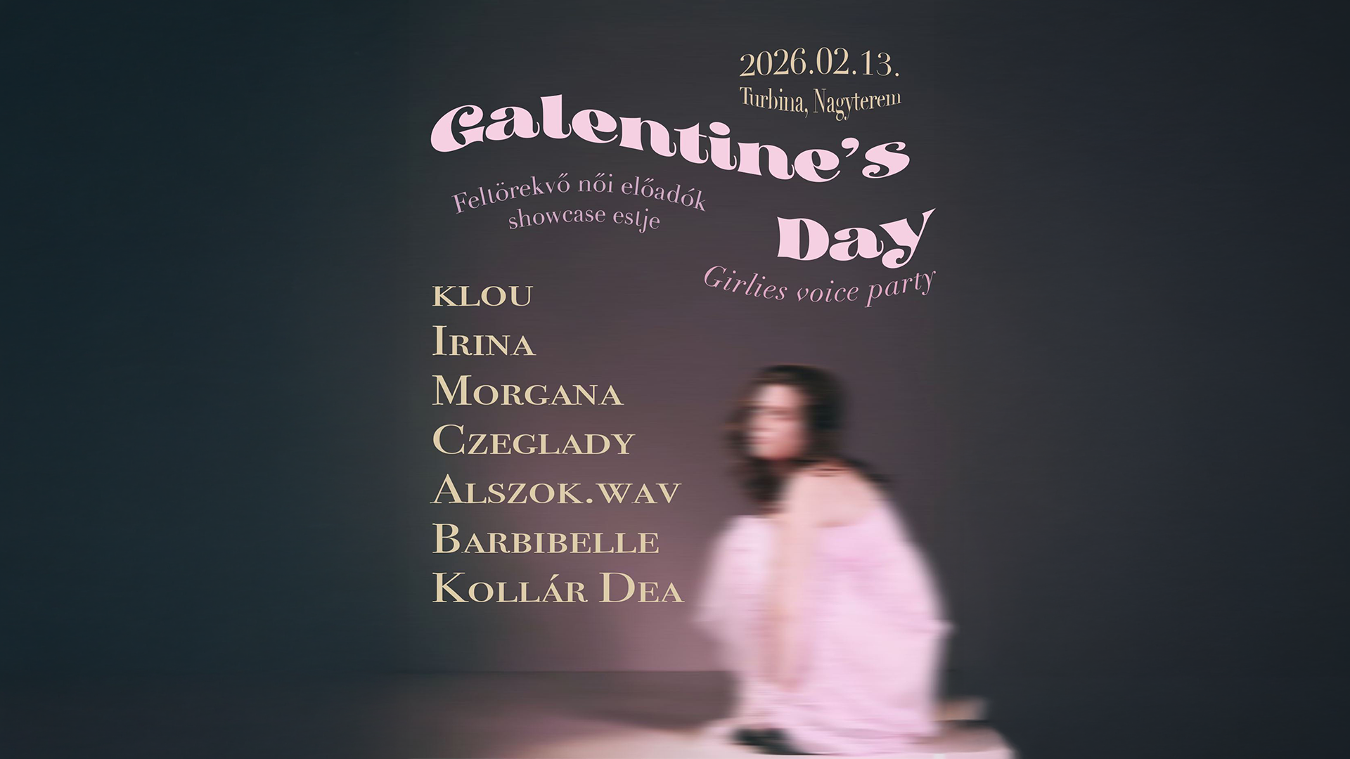 This night is all about community: girlfriends, shared moments, laughter, dancing, and of course, plenty of live music. In the Main Hall of Turbina, independent Hungarian female artists will take the stage for a showcase concert to share their unique voices, stories, and art.