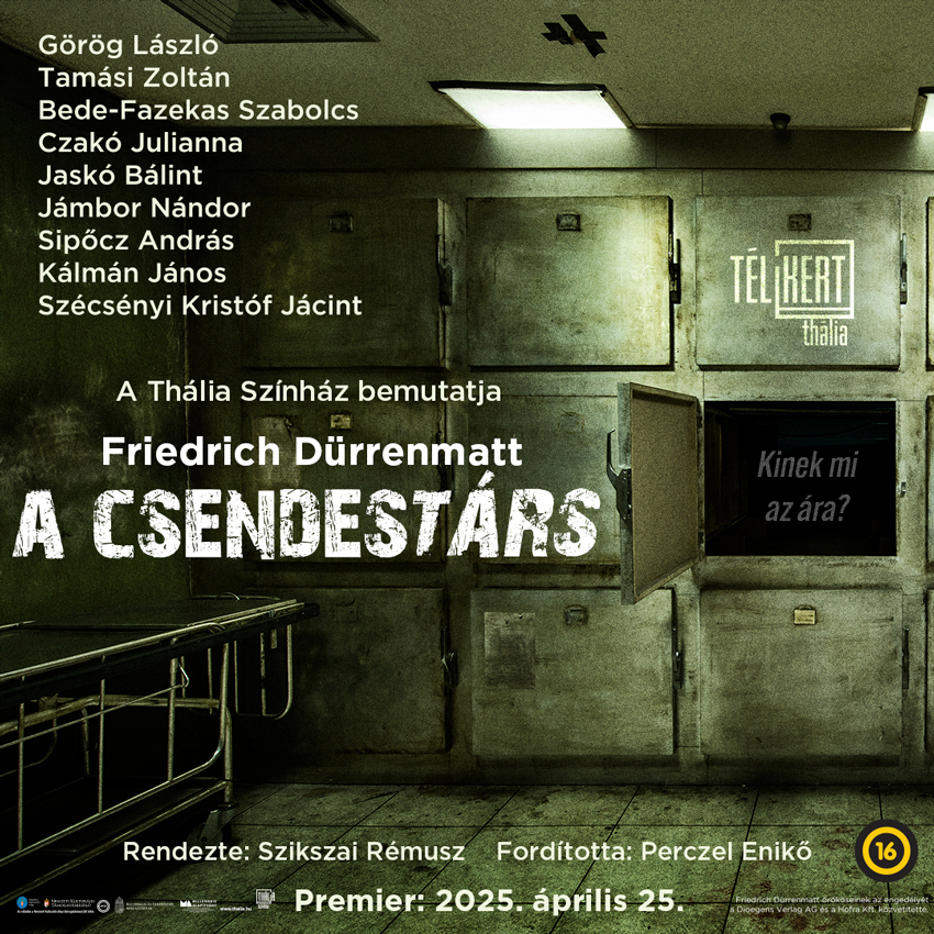 A csendestárs a Thália Télikert sötétebb vonalába illeszkedik. Kinek mi az ára? Tényleg a társadalom a hibás, ha az ember élete tönkremegy? Kié a felelősség? És mire elég az emberi szabad akarat? Komoly kérdések egy öt emelet mély bunkerben, fekete humorral, a hűtőkamra mellett, néhány cseppfolyósított hulla társaságában…