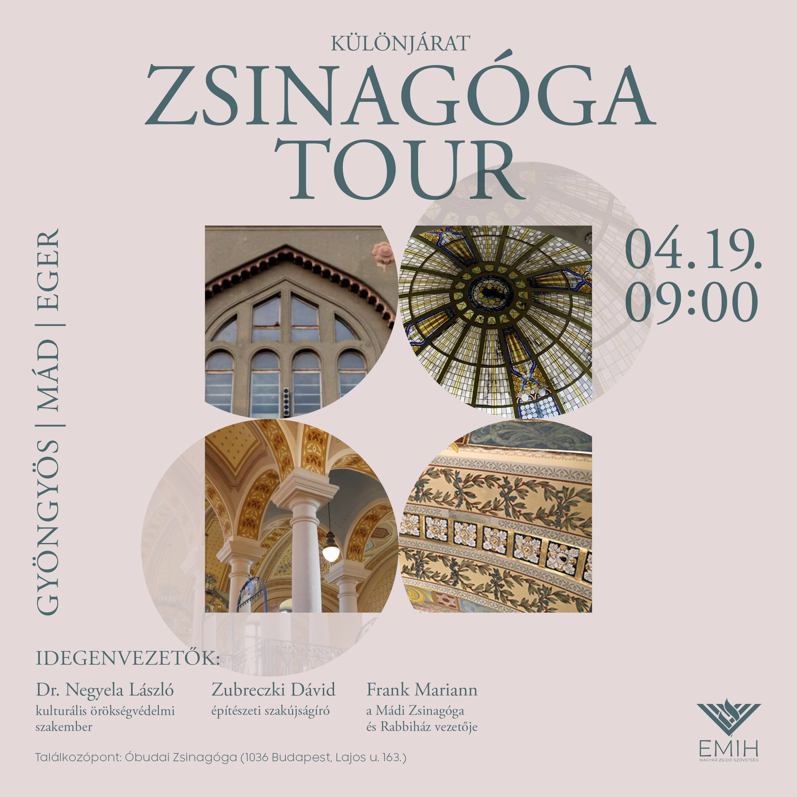 Egész napos buszos túra keretében három vidéki zsinagógába(n), kalauzol el minket dr. Negyela László kulturális örökségvédelmi szakember és Zubreczki Dávid építészeti szakújságíró: a gyöngyösi, a mádi és az egri zsinagógába(n).