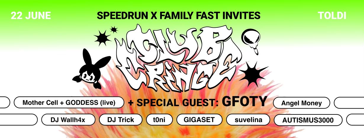 Club Cringe w/ Mother Cell + GODDESS, Dj Trick, DJ Wallh4x &&& Angel MoneyNew York City's very own dirty pop supergroup is coming to Budapest with a select lineup! The night will feature diamond diva Angel Money, ear-splitting noise pop trio Mother Cell + GODDESS, network virus DJ Wallh4x, and show runner DJ Trick. Known for reinventing the concept for club music, the night guarantees an unforgettable show with cutting-edge sounds && electrifying performances!
