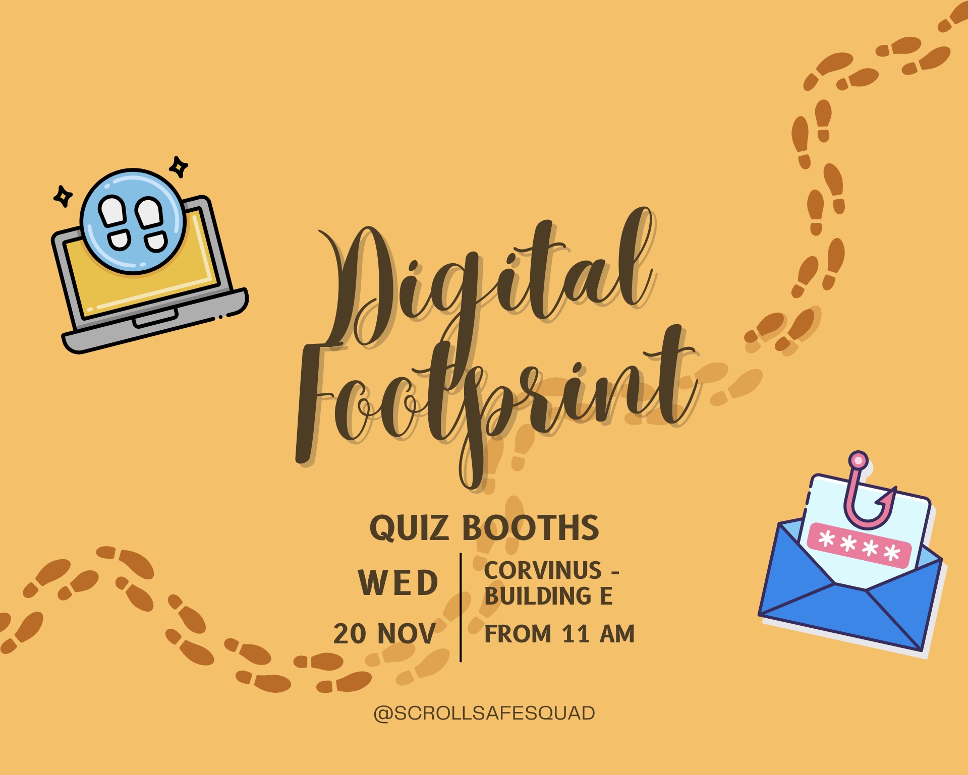 Csatlakozz a Scroll Safe Squad eseményéhez egy izgalmas napra, ahol felfedezzük digitális lábnyomodat! Az eseményünk során megtudhatod, hogy online tevékenységeid hogyan hagynak nyomot, és hogyan maradhatsz biztonságban a digitális világban.