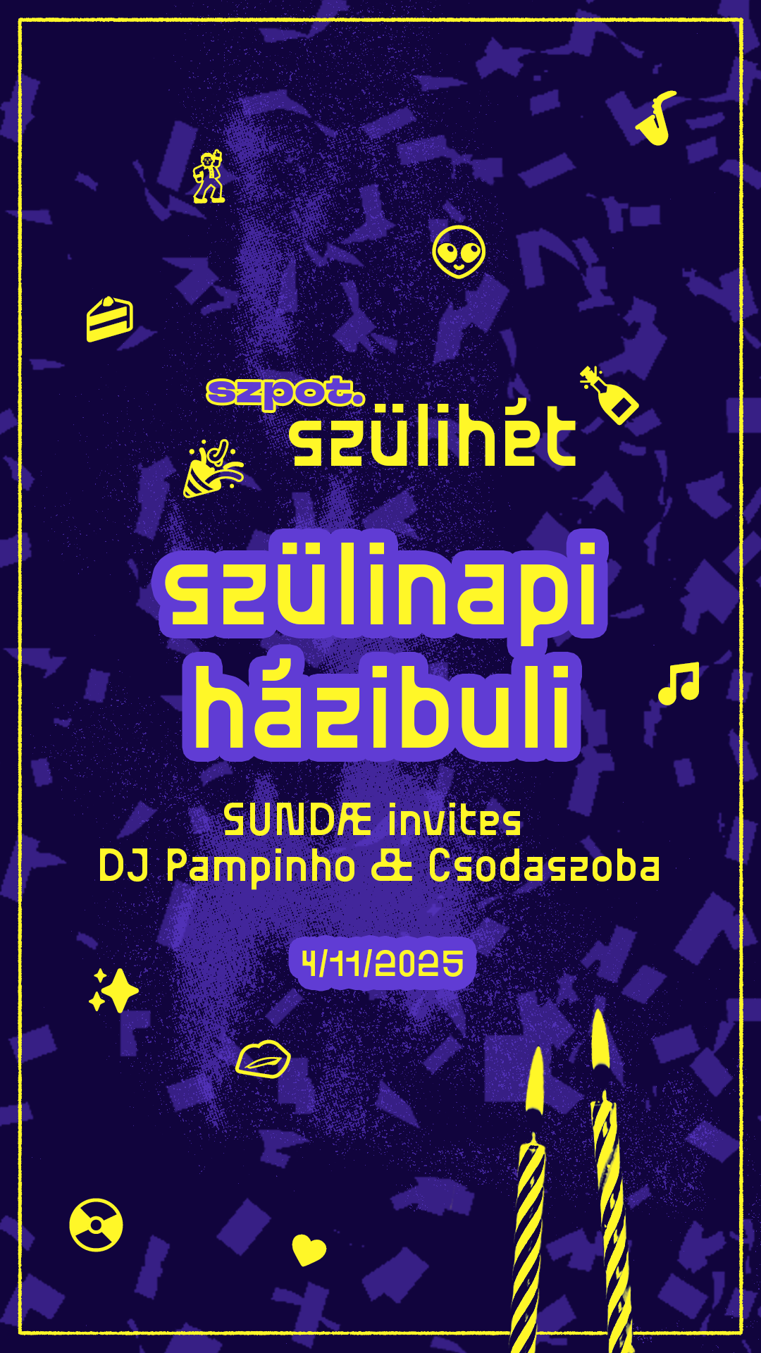 ez az este a szpot. szülihét csúcspontja, ahol minden összeér: a legjobb társaság, a legjobb zenék, a legjobb vibe. SUNDÆ, DJ PAMPINHO és a Csodaszoba zenéire nem bírsz majd nyugton ülni az asztalnál. ha csak egy estére jössz, ez legyen az.