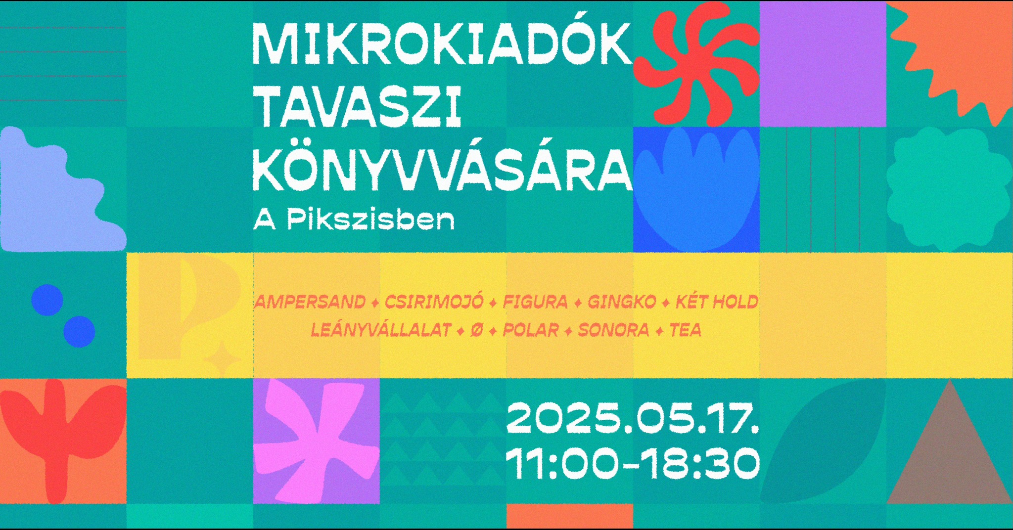 Május 17-én új résztvevőkkel, friss megjelenésekkel folytatódik hagyományos könyvvásárunk. Nagy örömünkre idén már tíz különleges könyvkiadó vár titeket: Ampersand, Csirimojó, Figura, Gingko, Két Hold, Leányvállalat, Ø, Polar, Sonora és Tea.