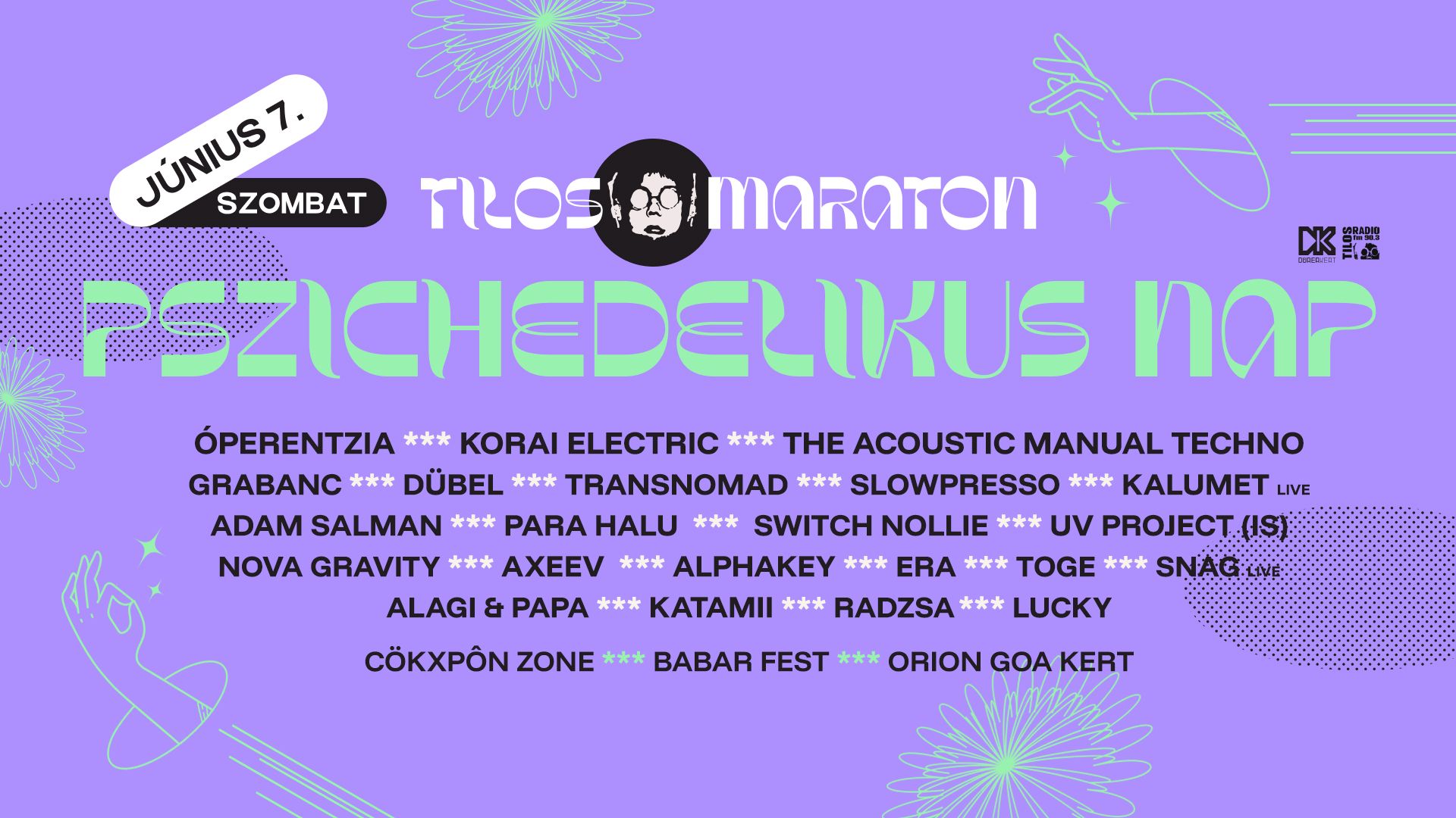 A Tilos Maraton nyitó hétvégéjének szombatja idén is a pszichedélia jegyében zajlik, ahol az élőhangszeres és elektronikus zenei spektrumok végtelen árnyalatai találkoznak idén 5 helyszínen a Dürer Kertben!