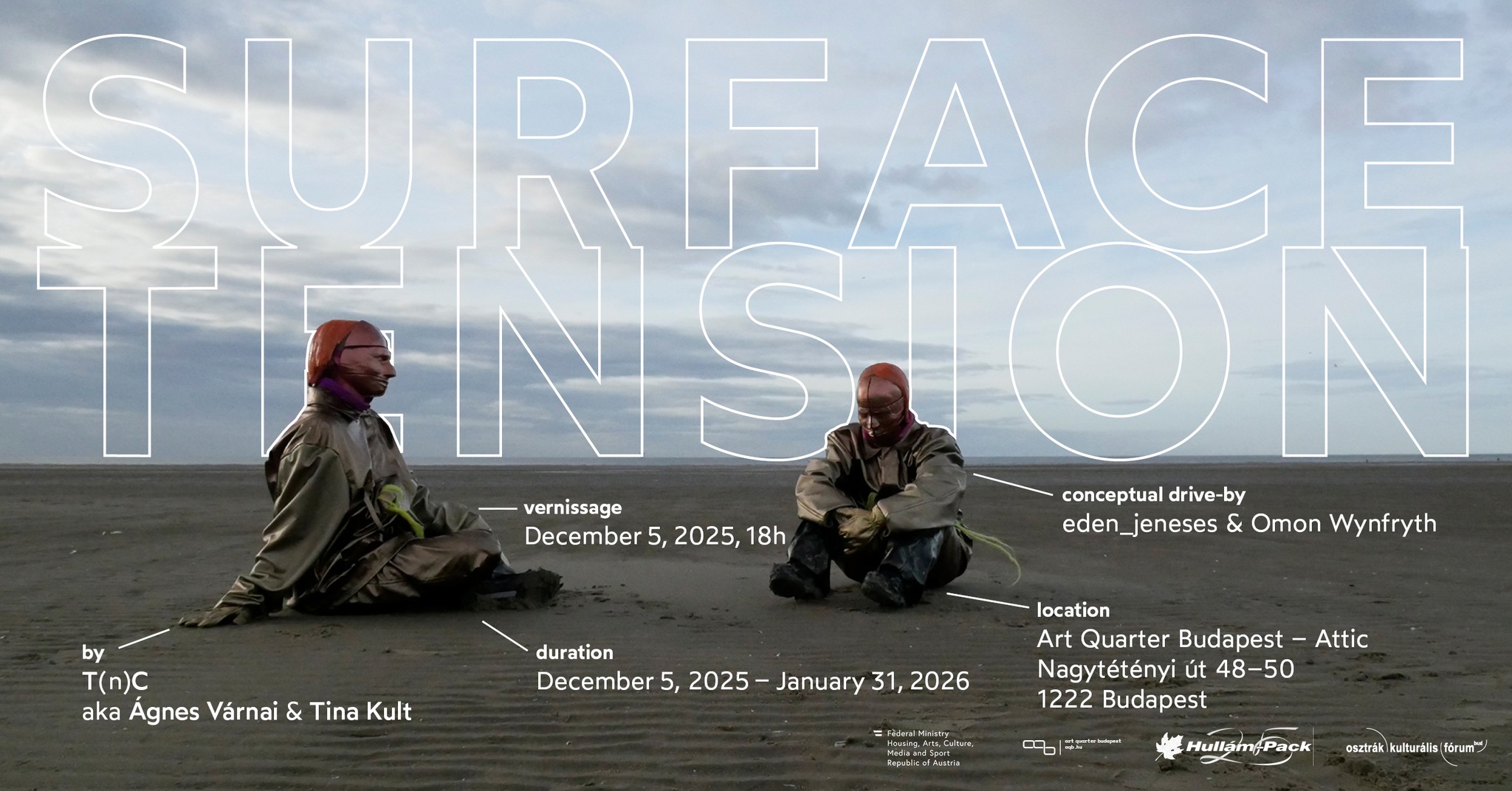 A képernyők, amelyek nem hajlandók világítani; az utolsó túlélő ciklikus útja és az álmodó robotok, akik a lustaságot választják a termelékenység helyett – a Surface Tension című kiállításban a T(n)C művészduója – Agnes Varnai és Tina Kult – az elmúlt négy évben készült, egymással összekapcsolódó multimédiás munkáiból hoz létre sajátos konstellációt. A kiállítás a hibás rendszerek repedéseiből kibontakozó lehetőségeket és a folyamatos nyomás alatt sarjadó új létezési formákat vizsgálja.