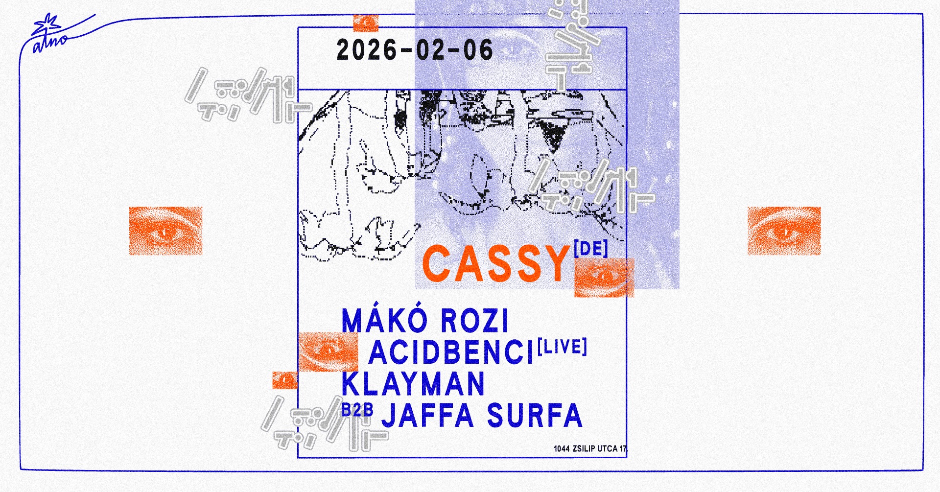 Cassy mellett az este magyar fellépői is fényesen csillognak majd, hiszen ők is ugyanolyan hiteles, tehetséges alakjai a tánczenei szcénának. Számtalanszor bizonyították már a rátermettségüket és külön az Atnoban is okoztak már maradandó emlékeket. 𝐉𝐚𝐟𝐟𝐚 𝐒𝐮𝐫𝐟𝐚 és 𝐊𝐥𝐚𝐲𝐦𝐚𝐧 nem először egyesítik erőiket, zeneszeretetük, elkötelezettségük és tudásuk tiszteletet parancsoló. 𝐌𝐚́𝐤𝐨́ 𝐑𝐨𝐳𝐢 szintén évtizedek óta pallérozza tudását, egy igazi zenei svájci bicska, aki ezen az estén kaleidoszkopikus techno lemezeit fogja hajnalban megmutatni. 𝐀𝐜𝐢𝐃𝐁𝐞𝐧𝐜𝐢 pedig ellenállhatatlanul lendületes saját house/deep house zenéit játssza majd élőben szintin és dobgépen.