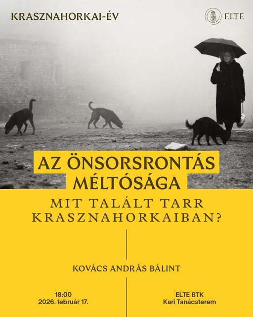 Krasznahorkai László és a nemrég elhunyt világhírű filmrendező, Tarr Béla közel közel negyven éven át tartó, egymást folymatosan segítő és erősítő alkotói együttműködéséből öt nagyjátékfilm született. Kovács András Bálint nemcsak könyvet írt Tarr Béla művészetéről, de az 1988-as Kárhozat című film művészeti konzultánsaként tanuja is volt e különleges alkotói kapcsolat kialakulásának. Előadásában azt vizsgálja, milyen hatással volt Tarr Bélára találkozása Krasznahorkaival.