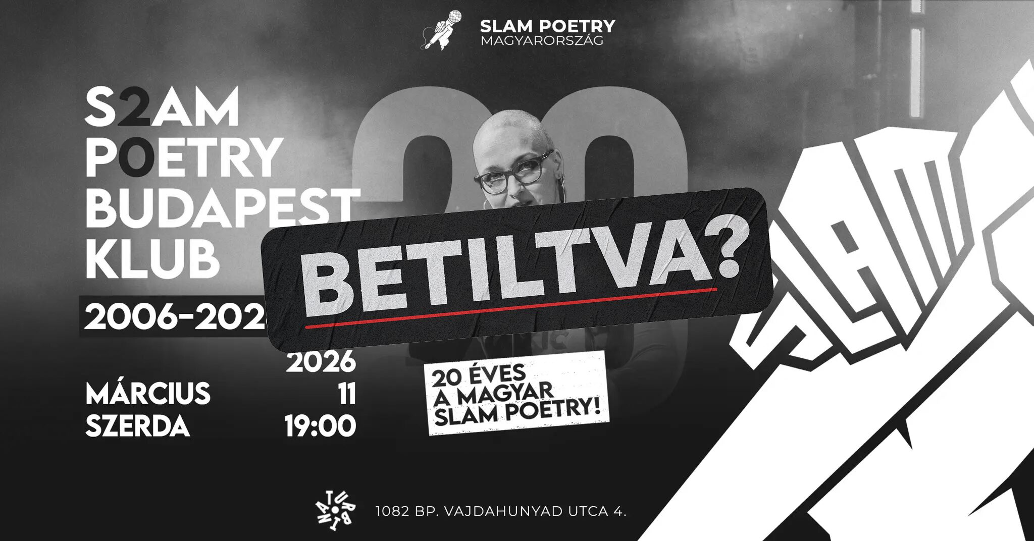 A Slam Poetry Magyarország az egész 2026-os évet az ünneplésnek szenteli. Magyarország legrégebbi és első számú, rendszeres slam poetry klubja, a Slam Poetry Budapest Klub jelenlegi helyszínén, a Turbina Kulturális Központban (Cím: Vajdahunyad utca 4, Budapest 1082), meglepetés vendégekkel indítja a születésnapot. A két évtized számos meghatározó alakja lép színpadra és segít „hostolni” az állandó műsorvezetőknek.