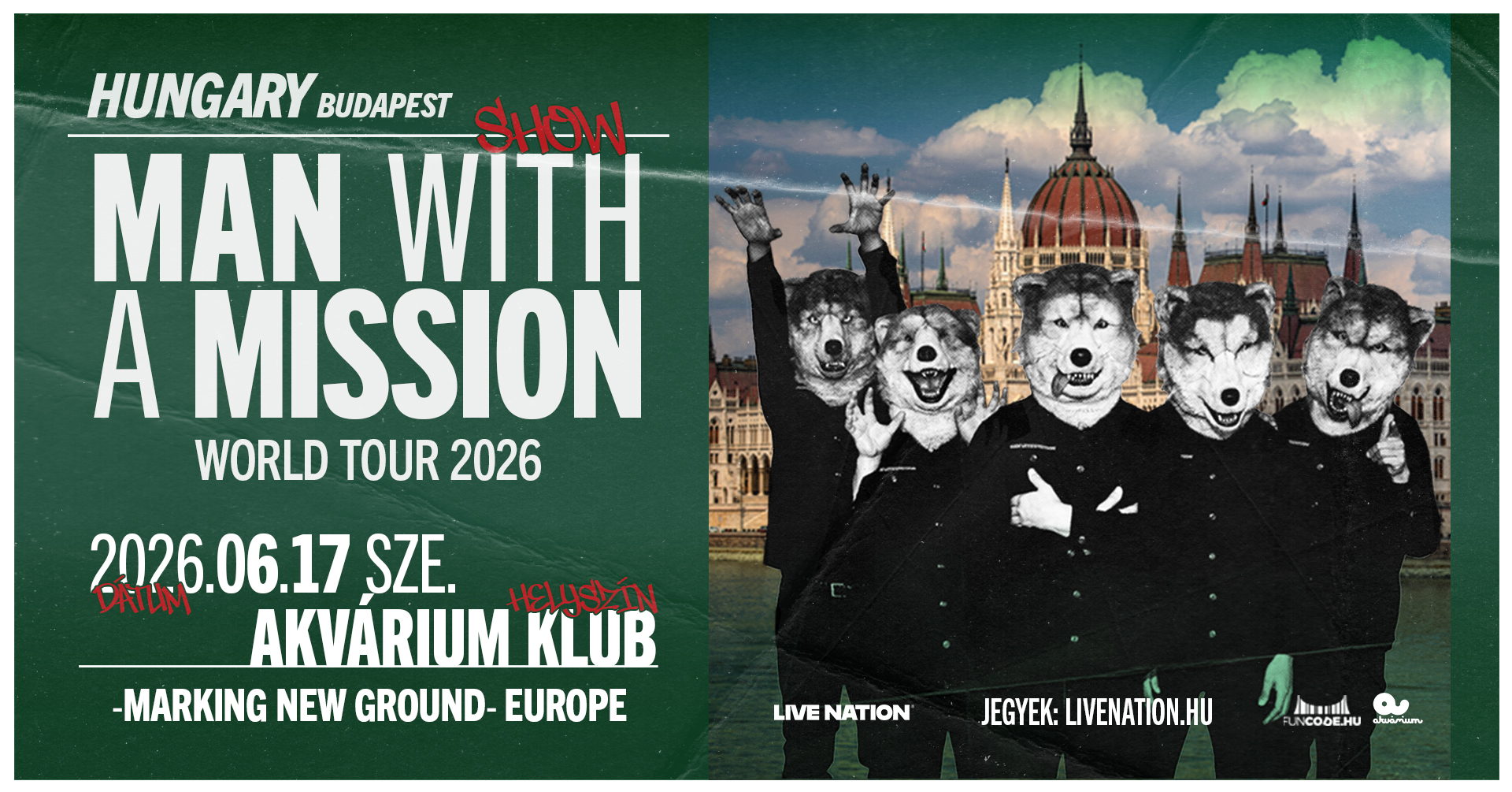 Június 17-én először ad koncertet Budapesten a világszerte ismert japán rockzenekar, a MAN WITH A MISSION. A különleges megjelenéséről – farkasfejű, embertestű karaktereiről – és energikus koncertjeiről híres együttes az Akvárium Klub színpadán lép fel, ahol a rajongók egy intenzív, látványos élő show-ra számíthatnak.