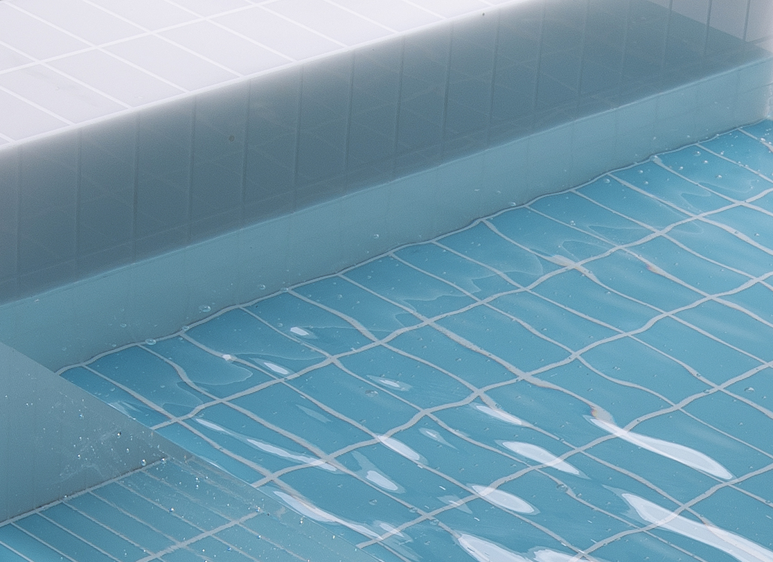 “Amikor az áttetsző anyag bekerül a néző és a tárgy közé, módosíthatja az eredeti látványt, így az anyag közvetítő közegként illetve jelenségként is definiálható, mivel a kettő összhatásaként egy harmadik minőség keletkezik. Az Úszómedence című sorozatomnál a geometrikus csempézet és a „víz” hullámai kerülnek kölcsönhatásba. Azzal kísérletezek, hogy a belső geometrikus struktúra, hogyan jelenik meg az üvegen keresztül. Az üveg felületén megjelenő hullámok és a fénytörések nagyon hasonlóak a vízfelülethez, torzítják, organikussá teszik a szabályos négyzeteket. A látvány a néző térbeli elmozdulásától mozgásba lendül. Az alkotások a Kelet- európai sportuszodák hangulatát és színvilágát idézik a kék csempe és fehér fúga tipikus elemeivel.”